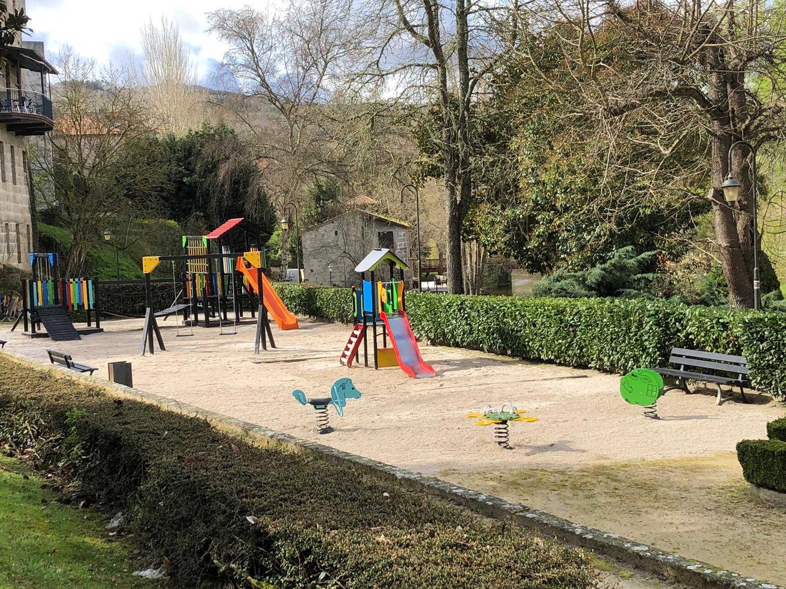 Zona de recreo al aire libre para los más pequeños con columpios de madera, mesas, fuentes y cerca de la playa fluvial