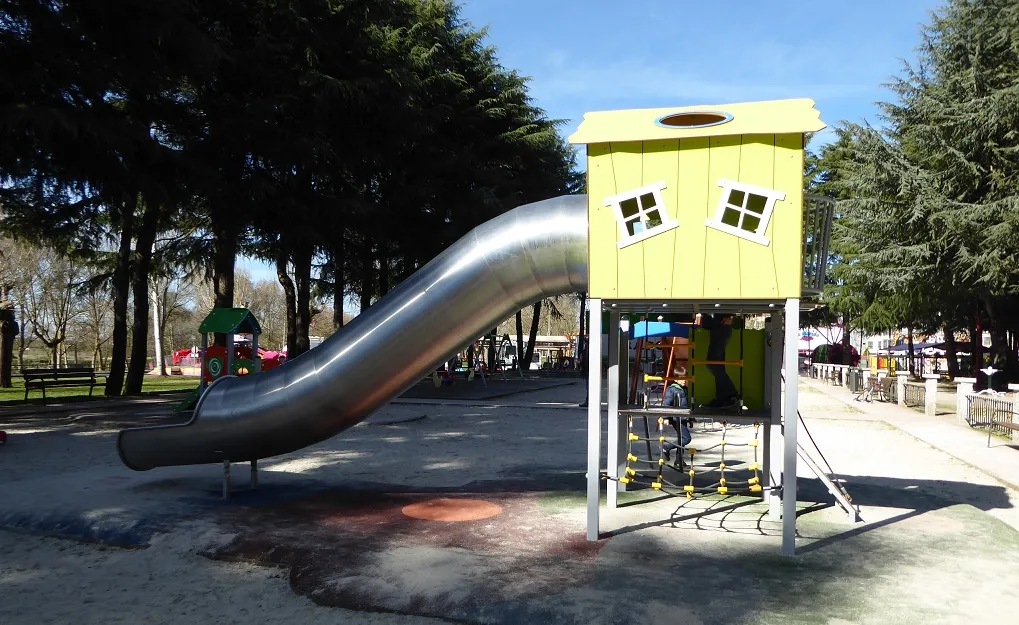 Parque natural con zona arbolada de paseo, cun gran parque infantil con tirolina, columpios e tobogáns e zona de calestenia para práctica de actividade física.