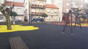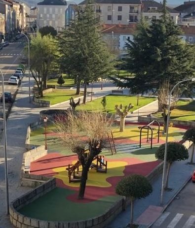 Parque con bancadas, árbores, espacio de xogo infantil e parque biosaudable.