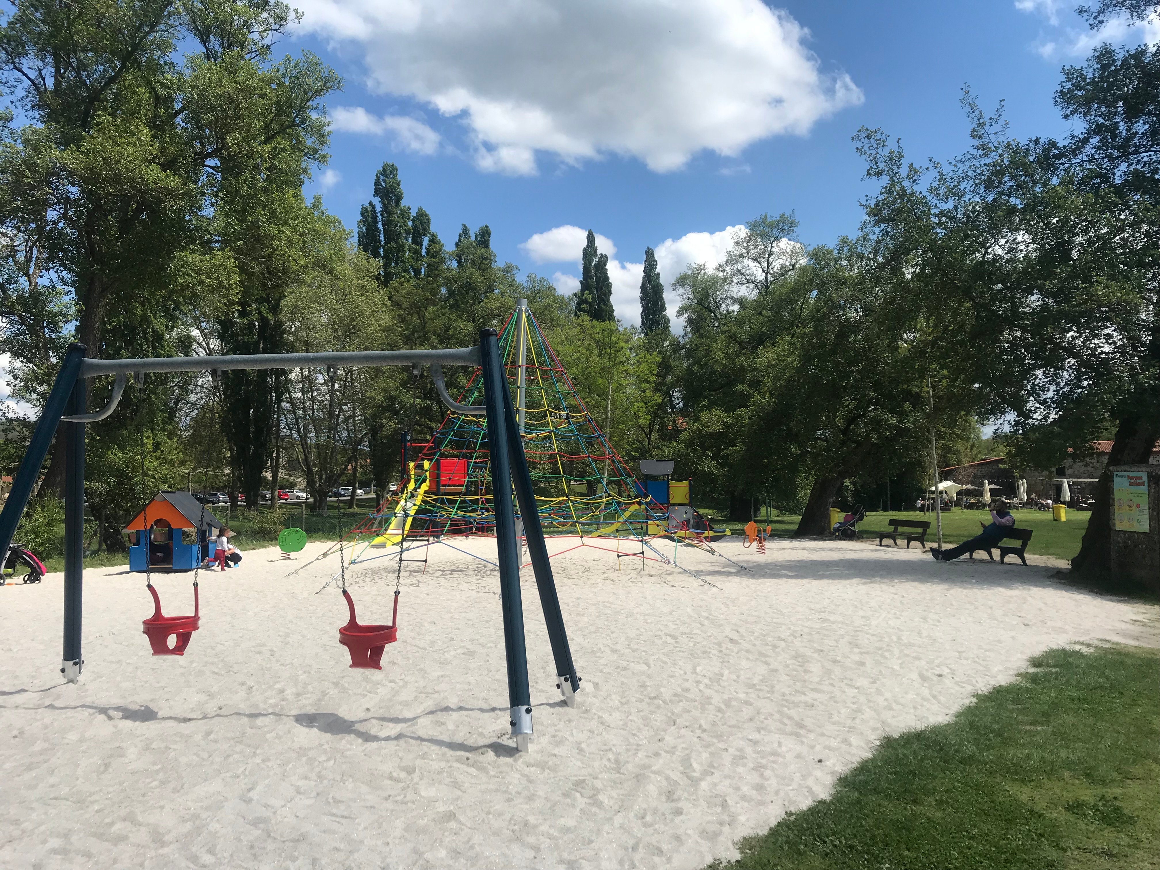 Zona de xogos infantil con varios columpios e chan de area, conta con bancos e zonas de herba natural a carón.