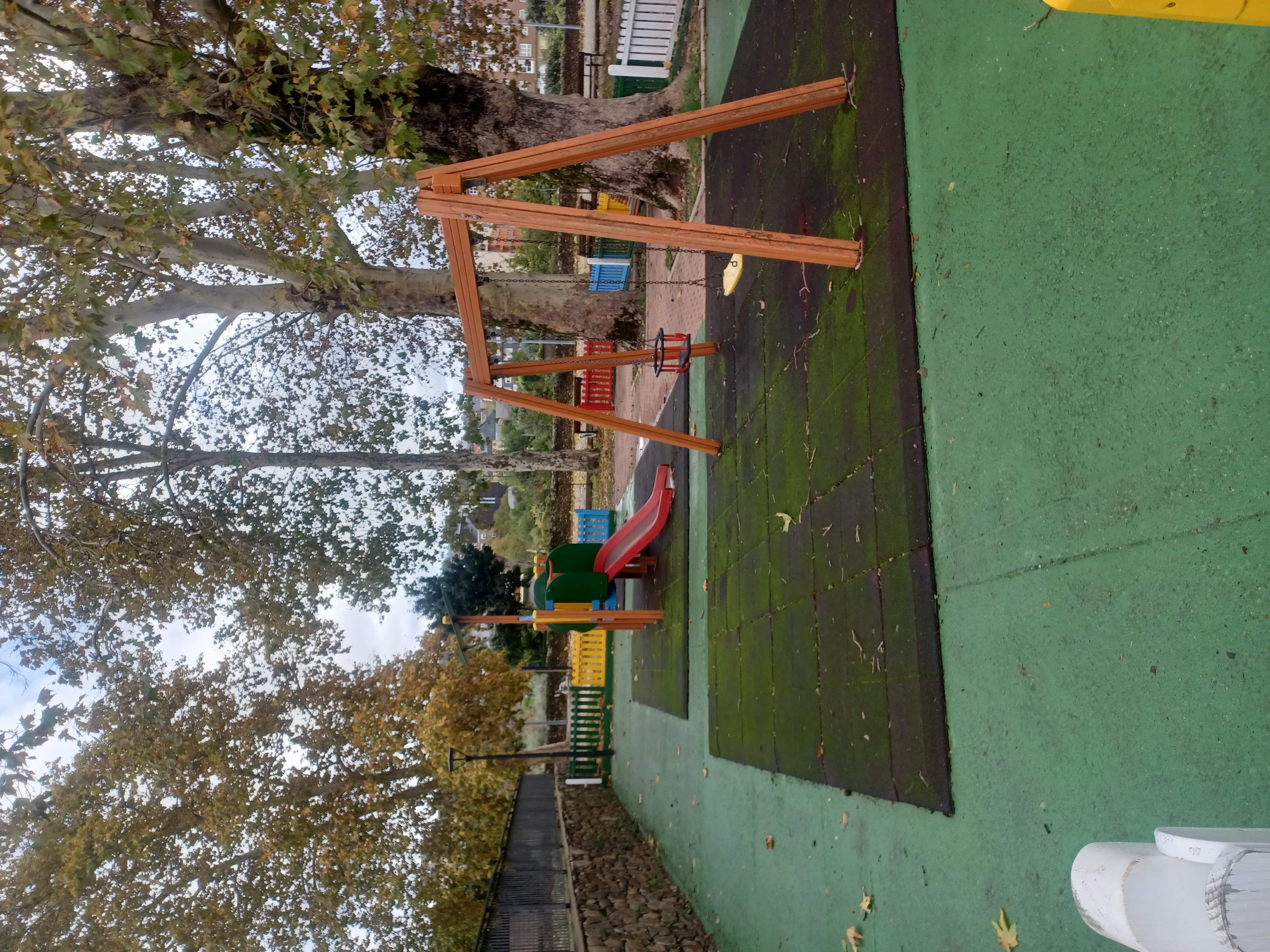 Zona verde con parque infantil e chan de corcho, zona de terra para práctica de diversos deportes, como a petanca, parque biosaudable e bancos