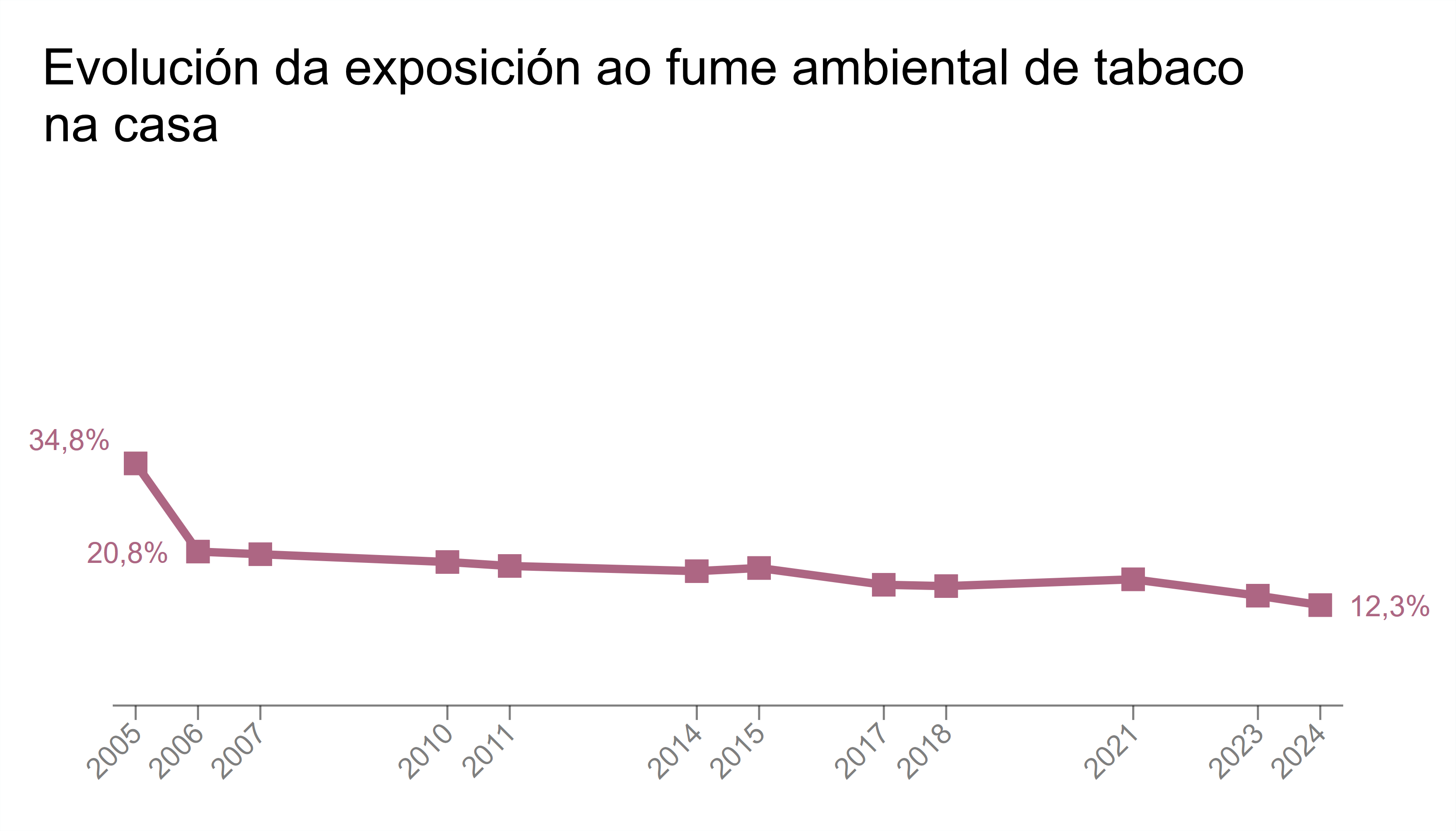 Apreciase como a porcentaxe de persoas que refiren que están expostas ao fume ambiental do tabaco na casa reduciuse a partir da implantación da normativa de tabaco do 2005 e moi pouco dende o ano 2006.