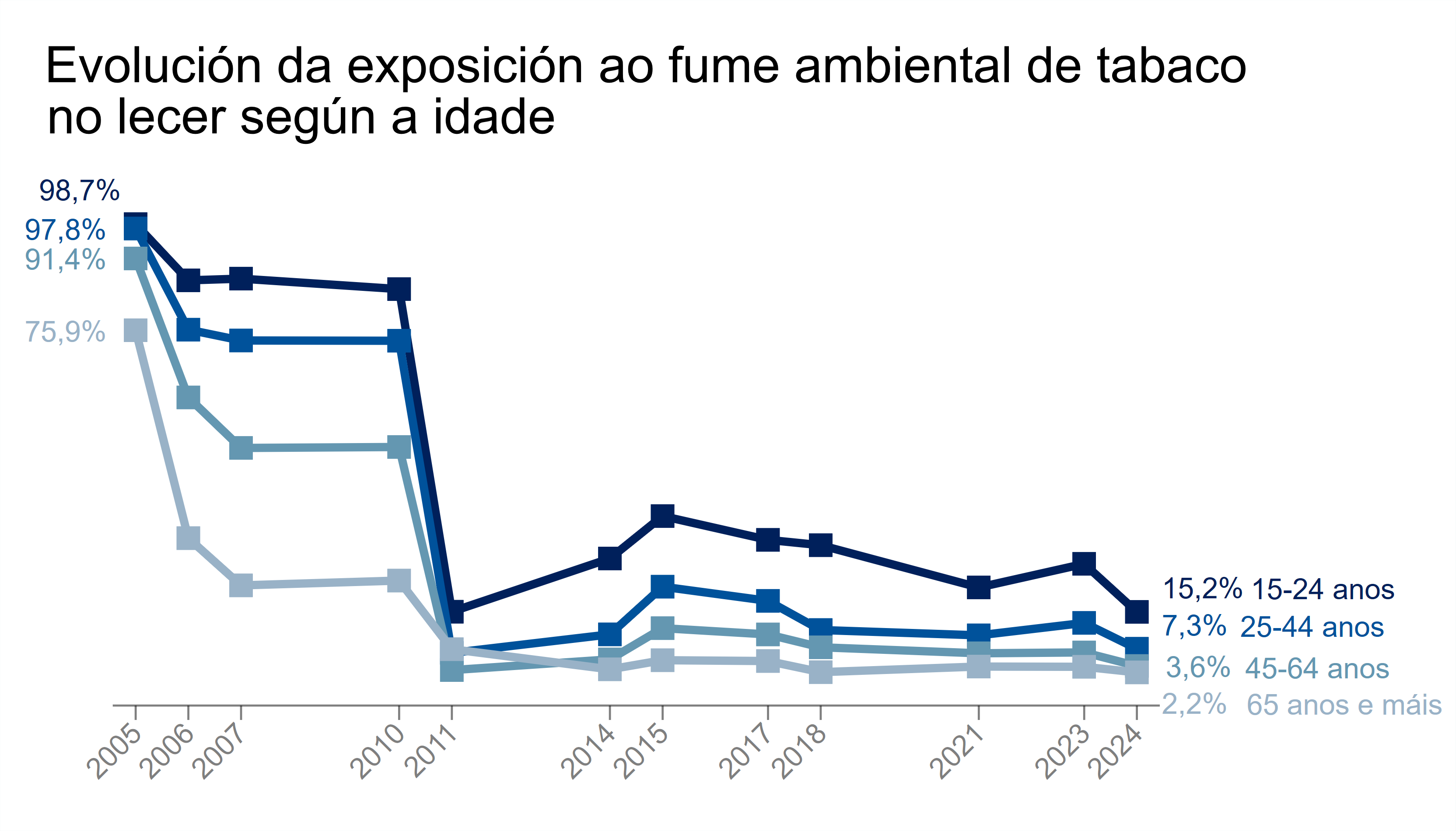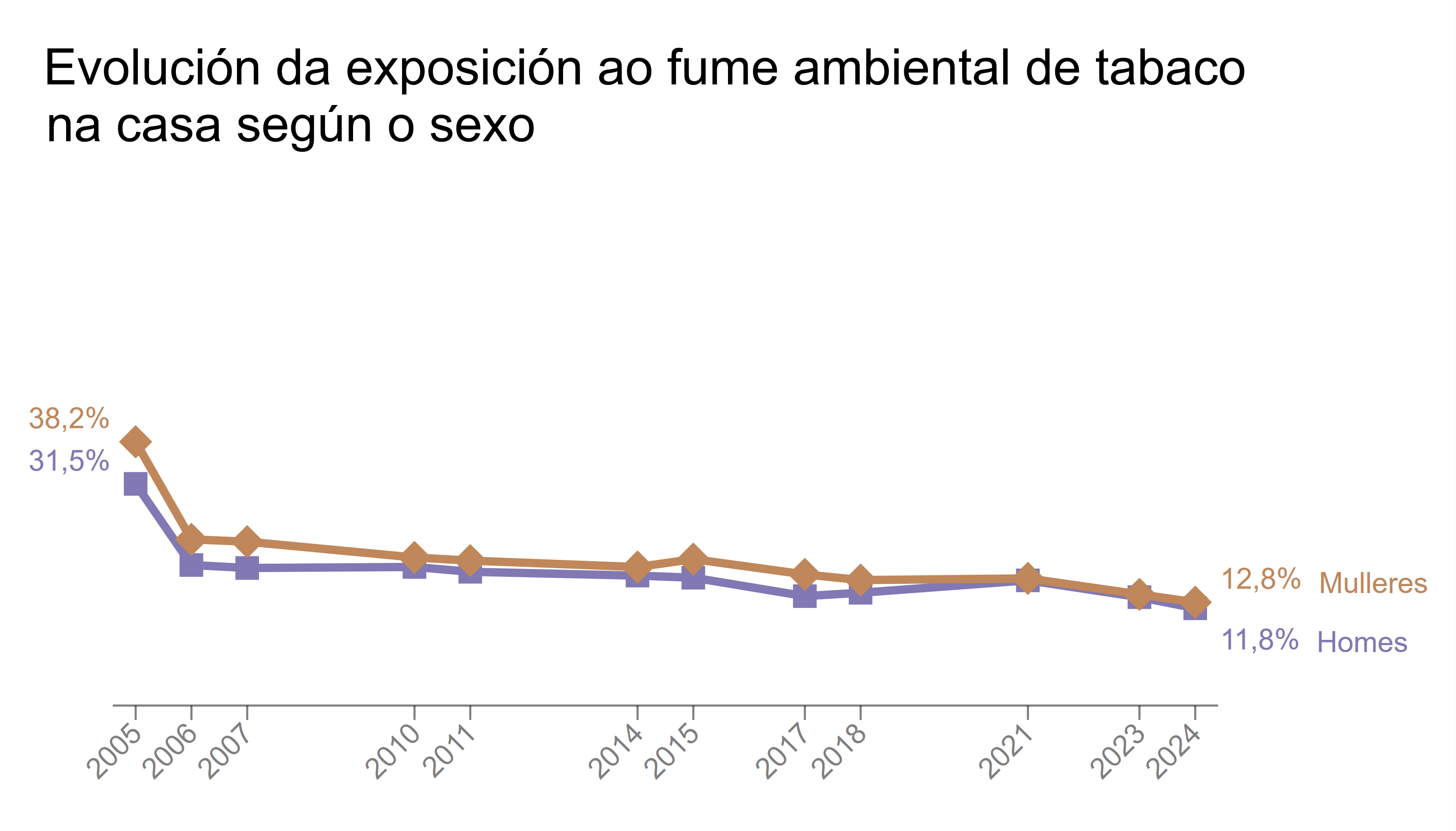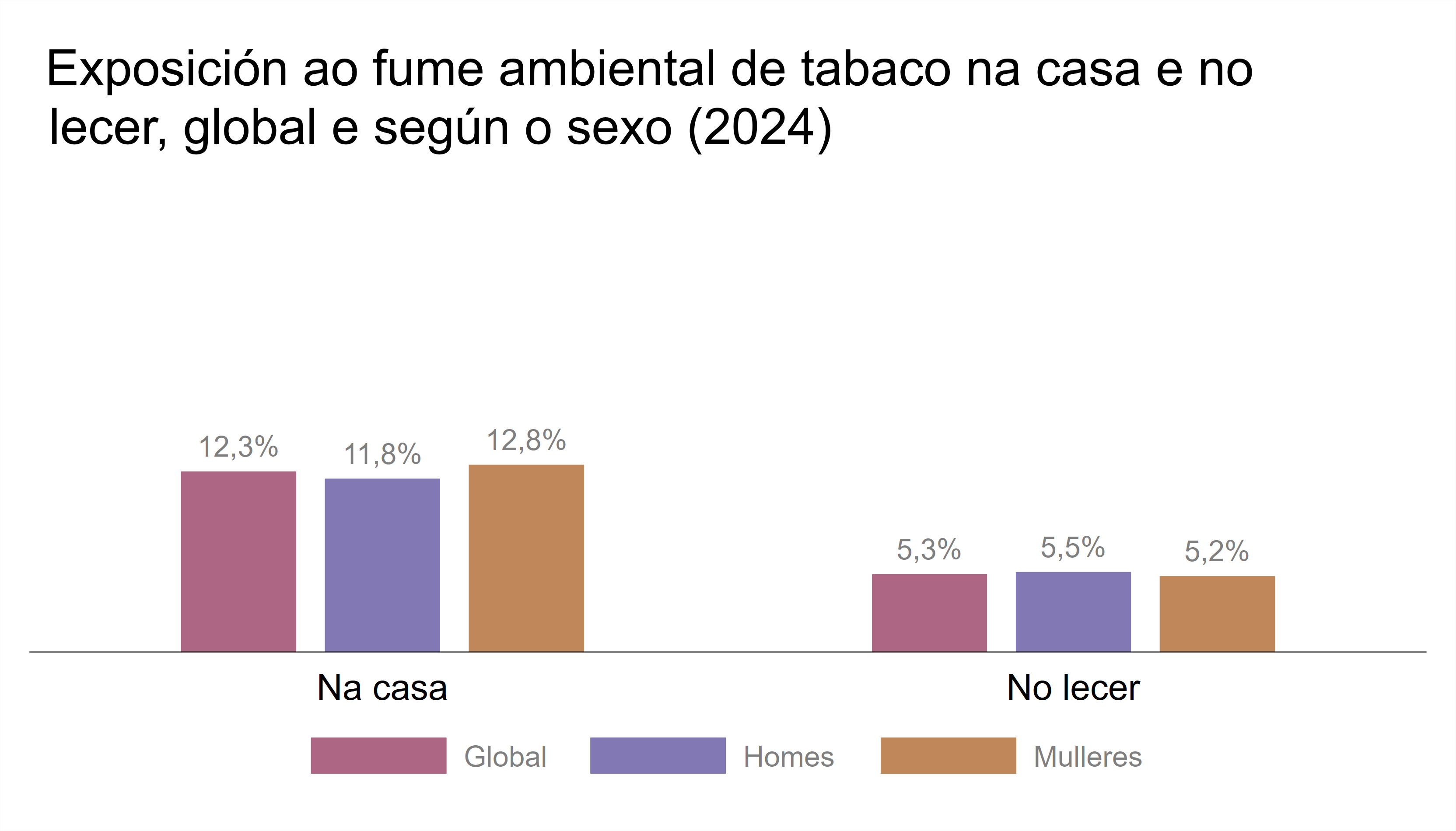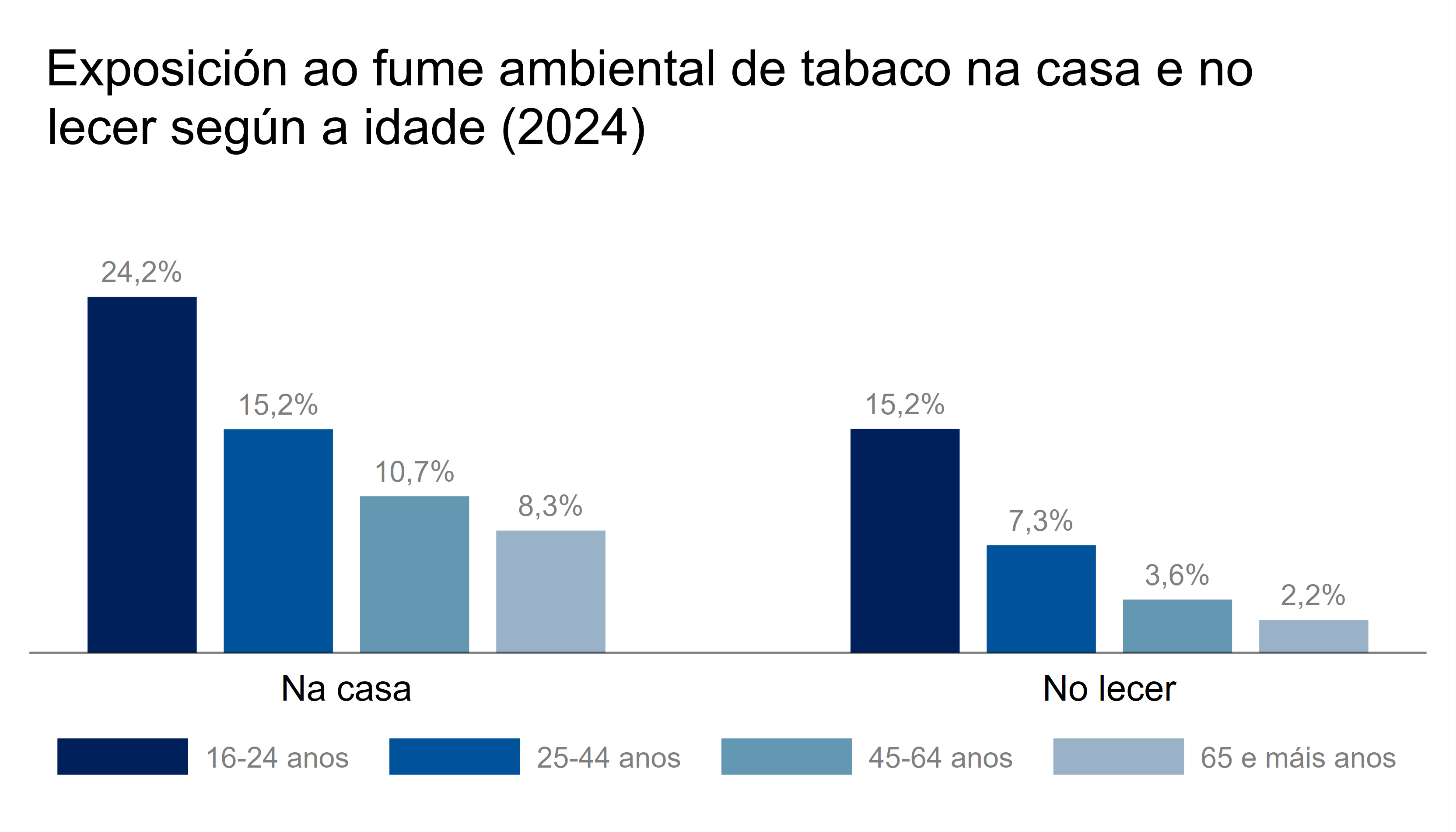 A porcentaxe de persoas que hoxe refiren que están expostas ao fume ambiental de tabaco na súa casa é, aproximadamente, do 12%. Nos espazos de ocio esta porcentaxe é do 5%. Non se aprecian diferencias entre homes e mulleres. A exposición diminúe claramente coa idade.