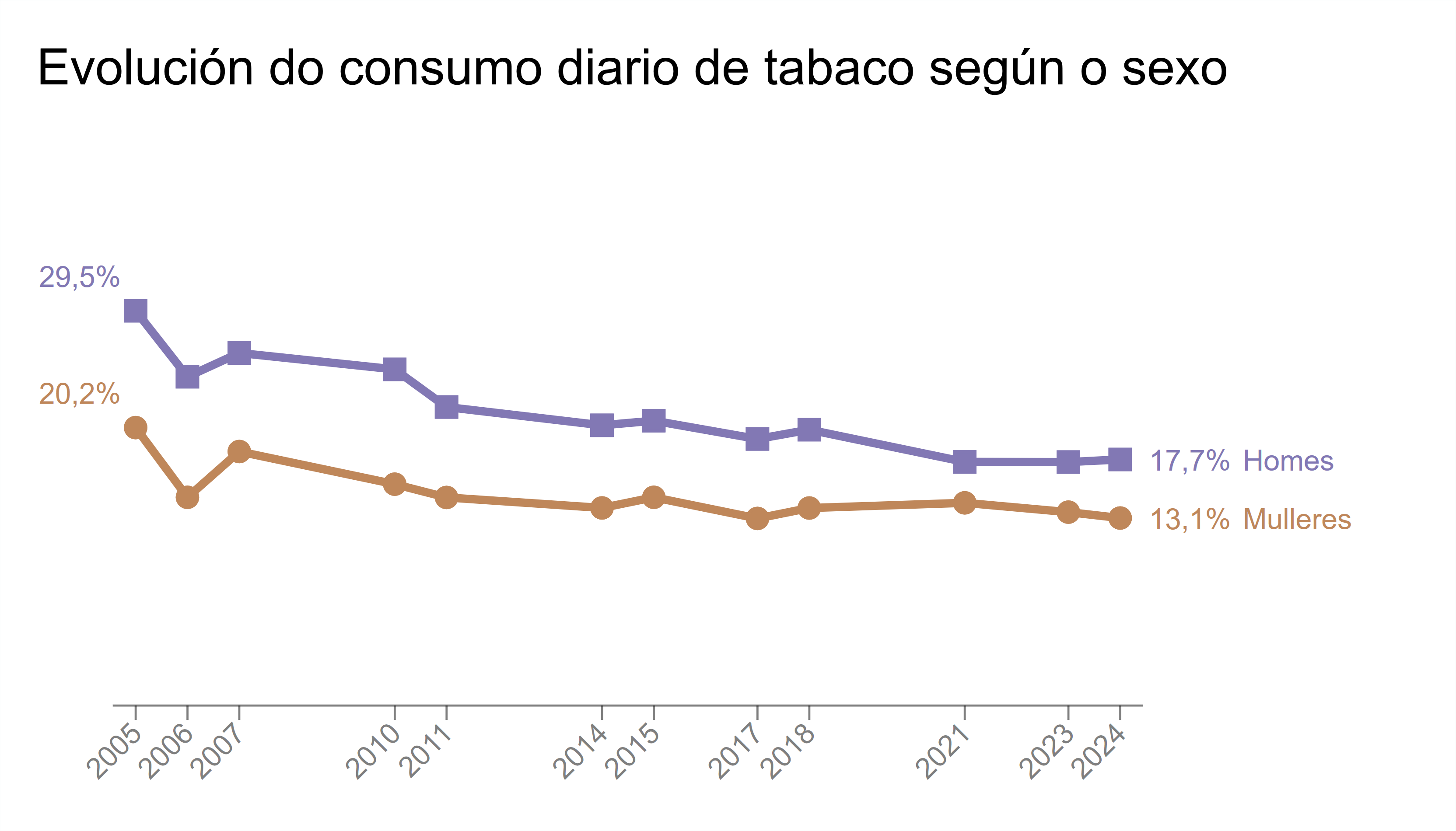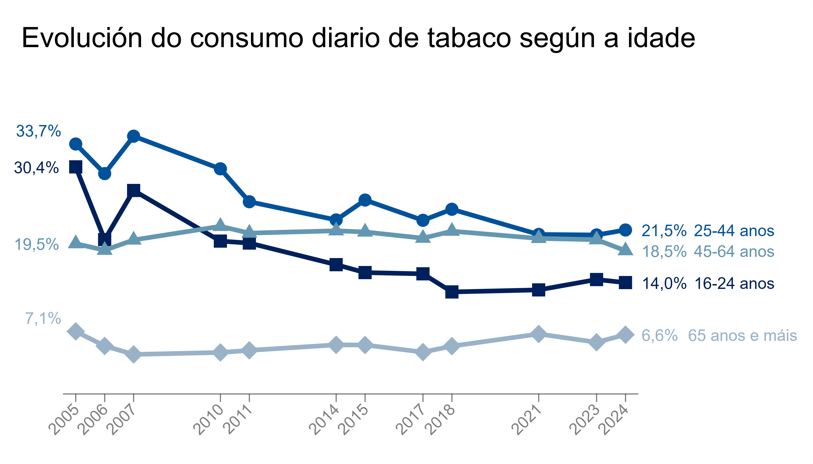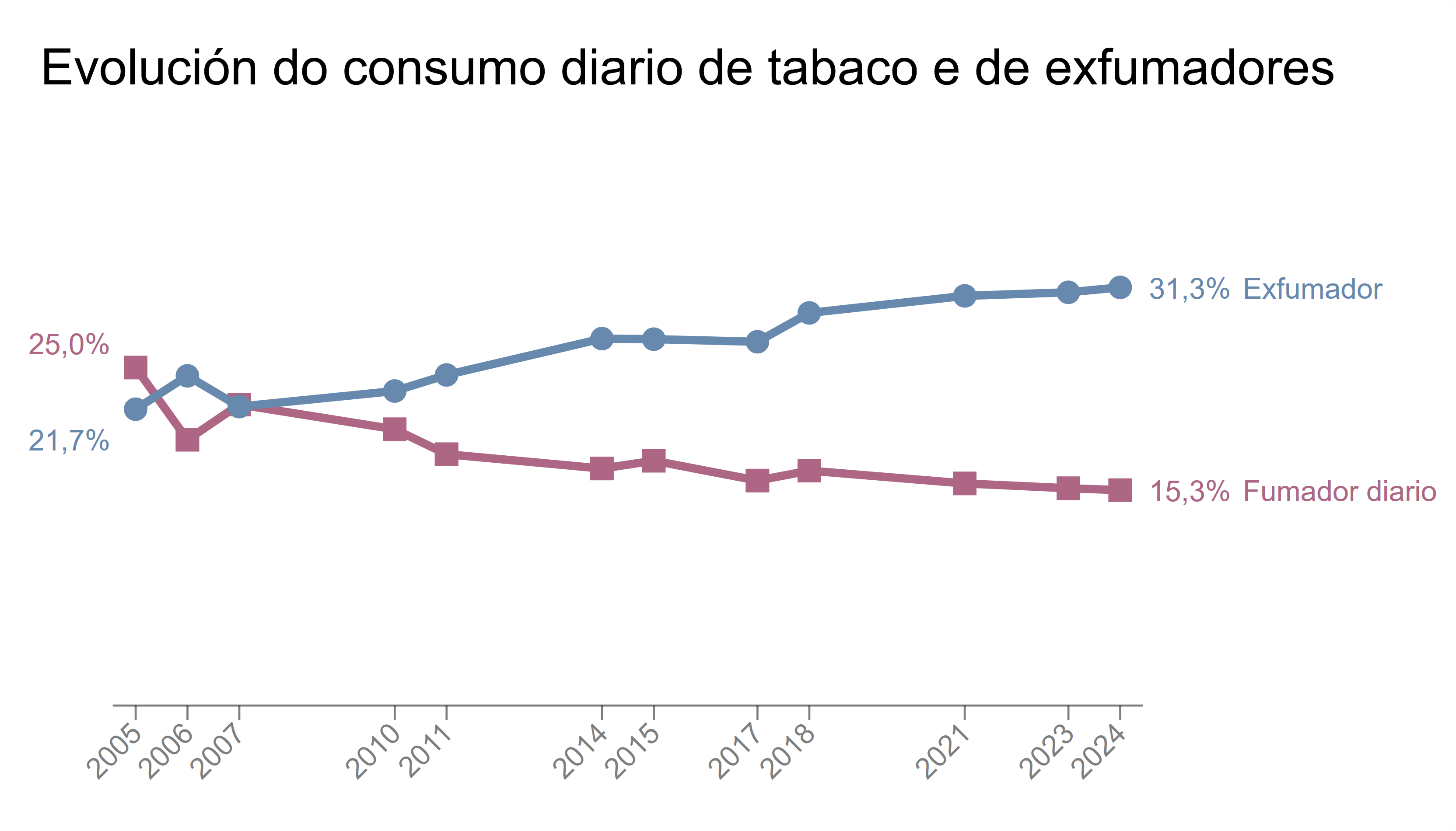 Os datos sinalan que na actualidade en Galicia fuma aproximadamente 1 de cada 6 persoas. Esta porcentaxe é maior nos homes e no grupo de idade de 25 a 44 anos.