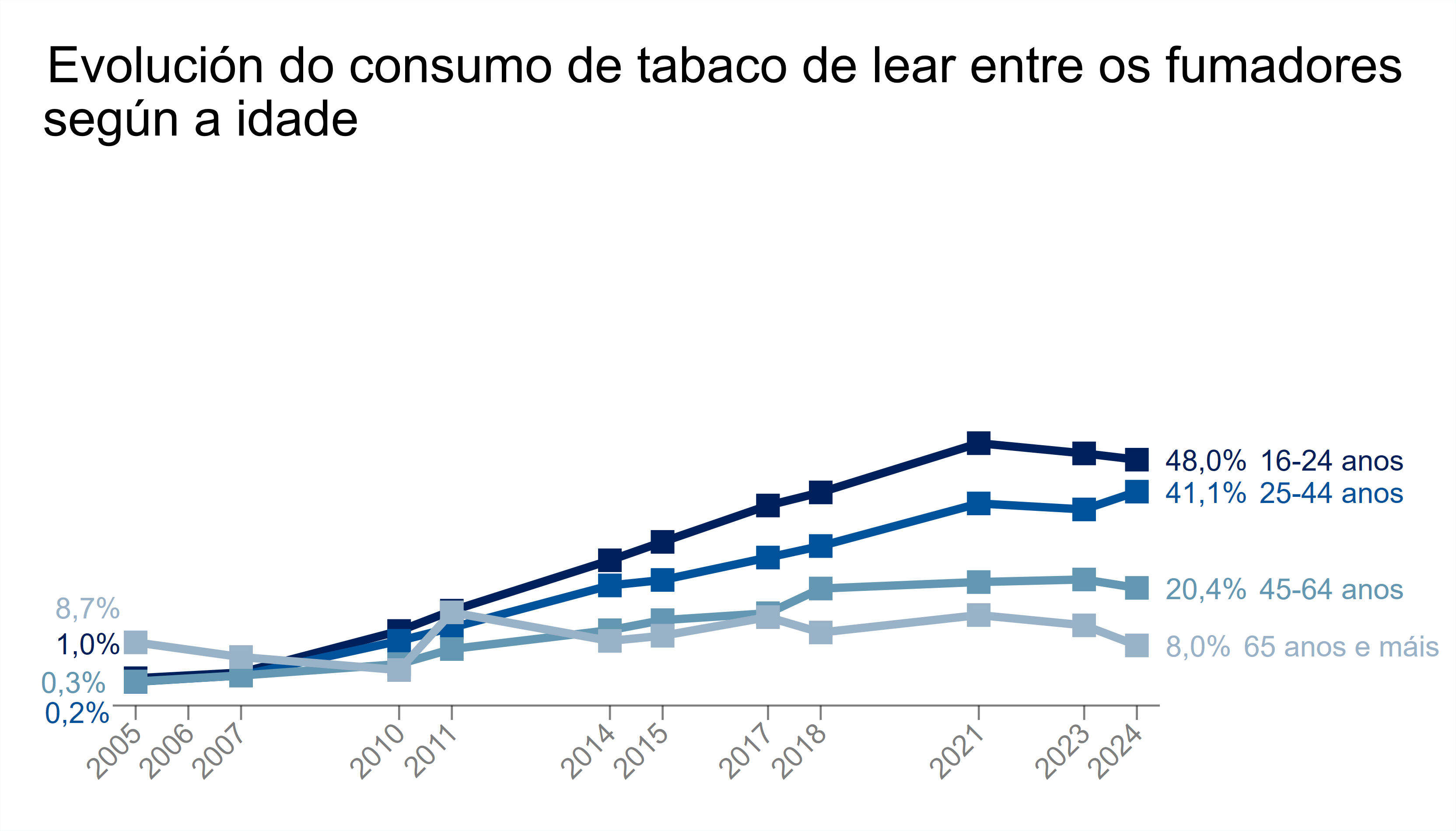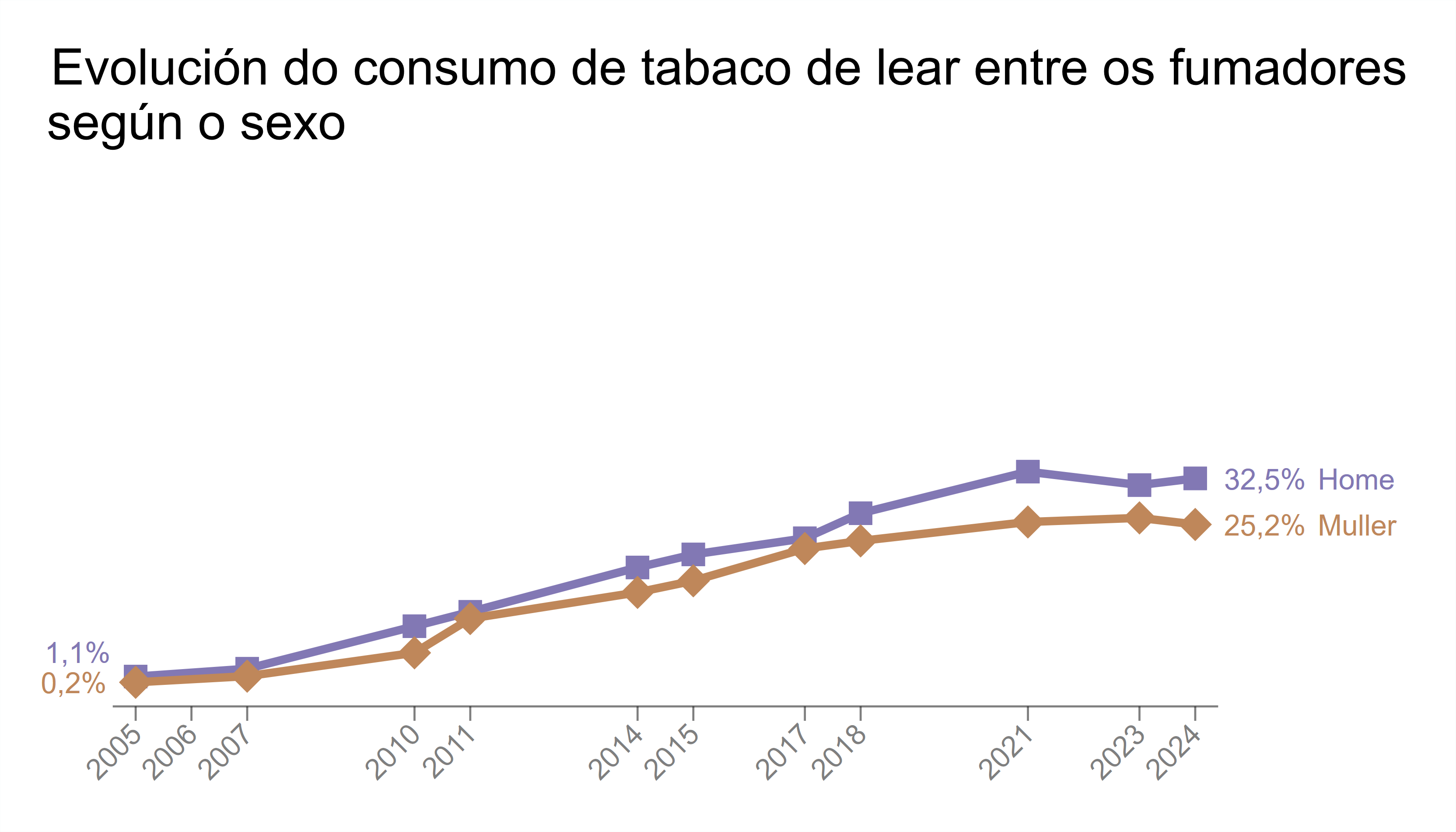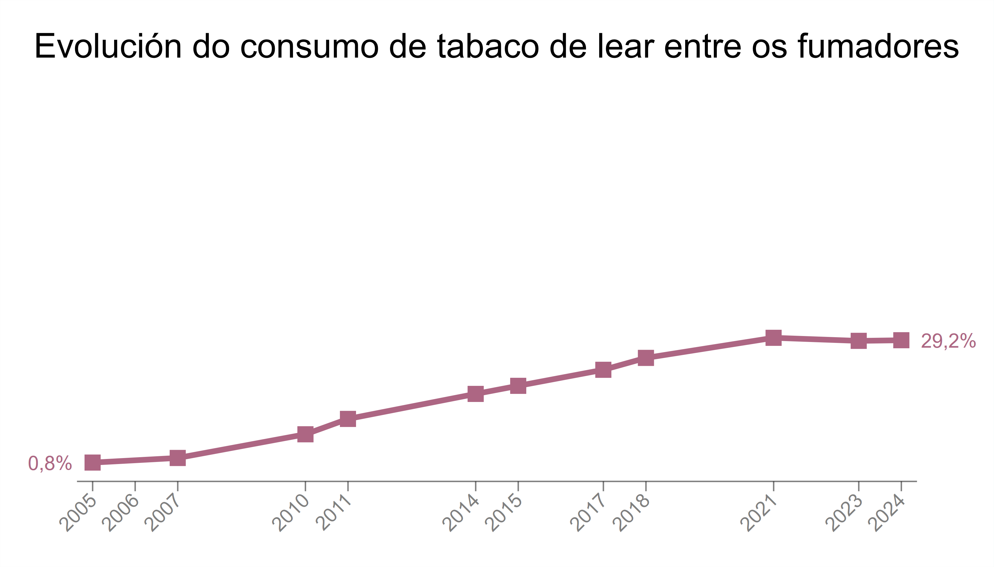 O consumo de tabaco de lear que, en 2005 era residual, chega agora a case 1 de cada 3 persoas fumadoras. Este consumo é maior entre os homes e os menores de 45 anos.